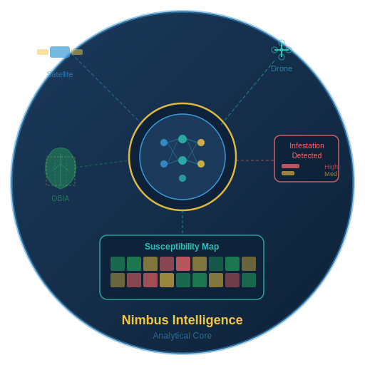 The analytical core. Satellite and drone imagery analysis for infestation detection and susceptibility mapping. OBIA-based feature extraction captures leaf morphology, canopy structure, and plant geometry for field-level diagnostics.