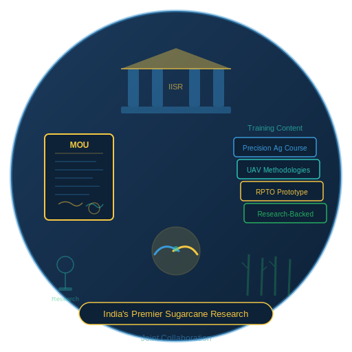 Joint collaboration for developing training content, precision agriculture courses, and research-backed UAV methodologies. MOU signed for establishing prototype RPTO and specialized training programs at India's premier sugarcane research institution.