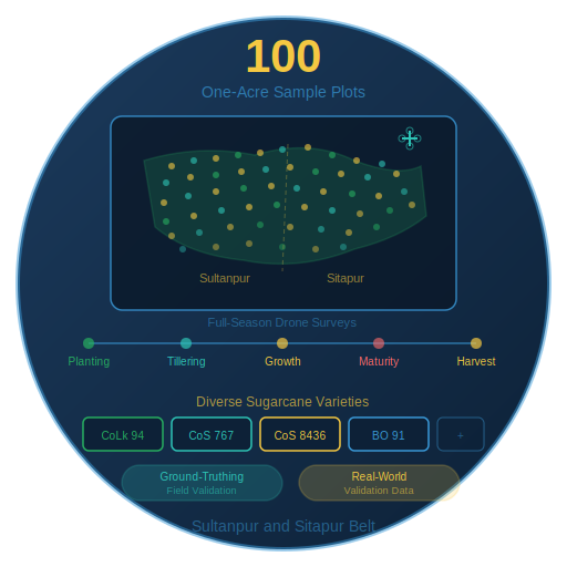 Supporting with 100 one-acre sample plots in the Sultanpur and Sitapur belt for full-season drone surveys and ground-truthing. Real-world validation across diverse field conditions and sugarcane varieties.