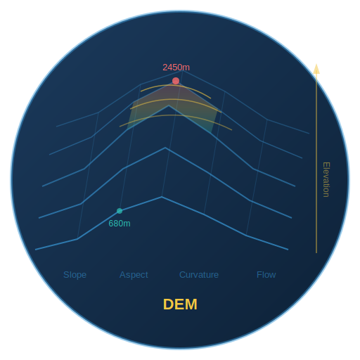 High-resolution terrain data for slope, aspect, curvature, and flow accumulation analysis.
