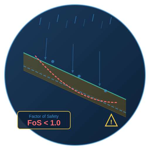 Rainfall infiltration simulation, pore pressure rise, and dynamic material modeling. Calculates Factor of Safety (FoS) — when FoS drops below 1.0, failure is imminent.