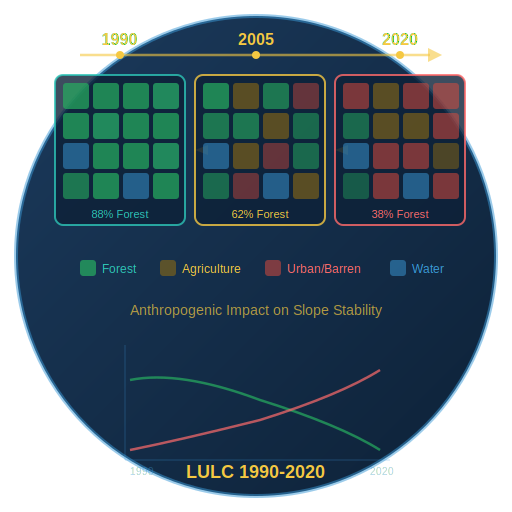 Three decades of LULC change data to assess anthropogenic impact on slope stability.