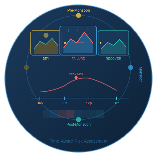 Captures seasonal terrain dynamics from pre-monsoon degradation to monsoon-triggered failures for time-aware risk assessment.
